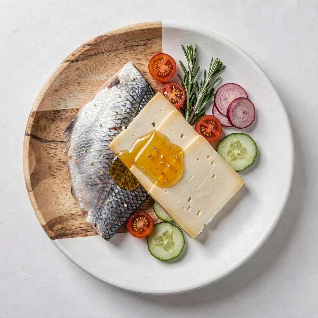 Sinergia entre aminoácidos de origem animal (peixe de águas frias) e vegetal (tremoço, feijão). Essencial para a preservação da massa muscular.